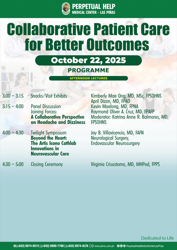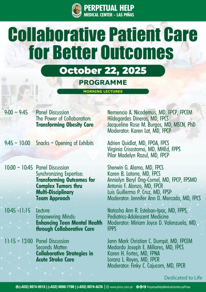 You are invited to the Perpetual Help Medical Center – Las Piñas’ Postgraduate Course: “Collaborative Patient Care for Better Outcomes” this October 22, 2025 from 7:00 AM to 5:00 PM at the Acacia Hotel, Alabang. This is your opportunity to join expert speakers for insightful discussions, enhance your clinical collaboration, and gain valuable CPD Units!